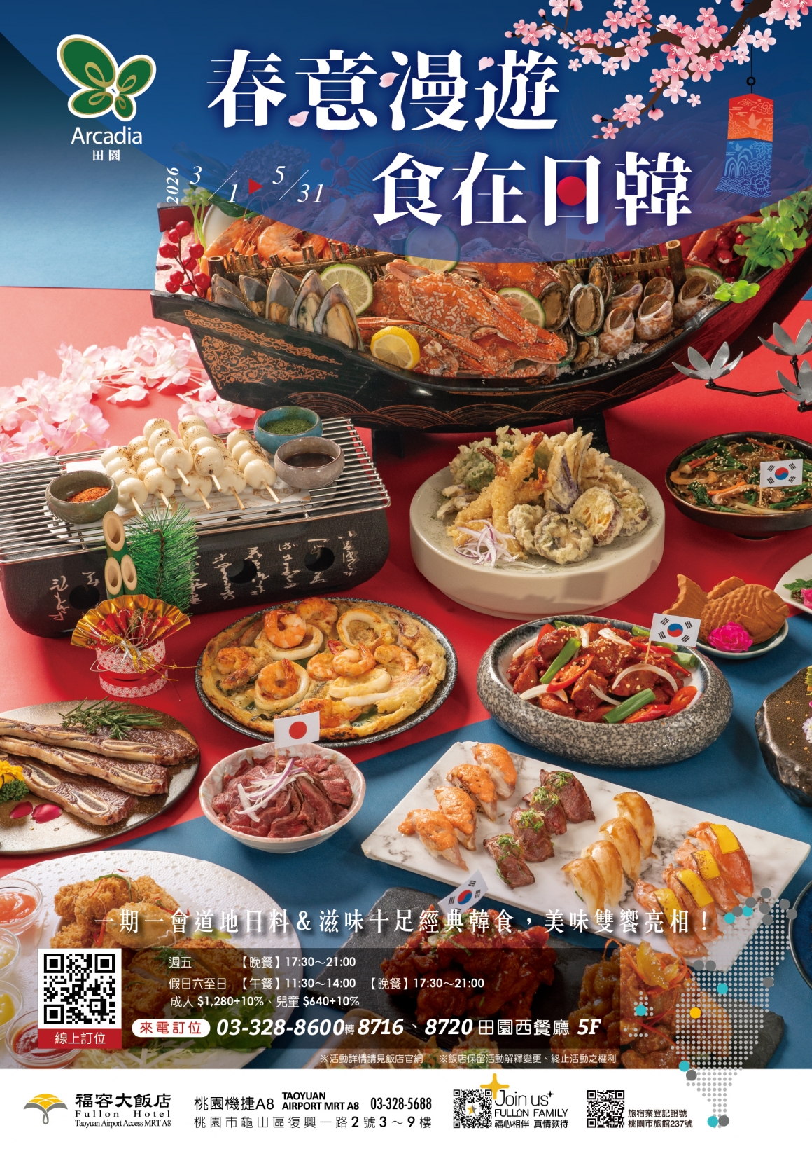 跟隨萬物復甦、綠意盎然的腳步,2026/3/1~2026/5/31期間(週五晚餐及周末假日午、晚餐),福容桃園機捷A8店田園西餐廳推出最新一季『春意漫遊.食在日韓』自助盛宴,一次嘗盡獨家日韓美味,和風天婦羅、酥炸廣島牡蠣、牛腩咖哩、現做手捲握壽司等道地日料,攜手韓式五花肉、春川辣炒雞、海鮮煎餅、半半炸雞經典韓食連袂出擊,現點現煎區加碼香煎牛小排、蔥鹽雞肉串,全面攻佔饕客味蕾~