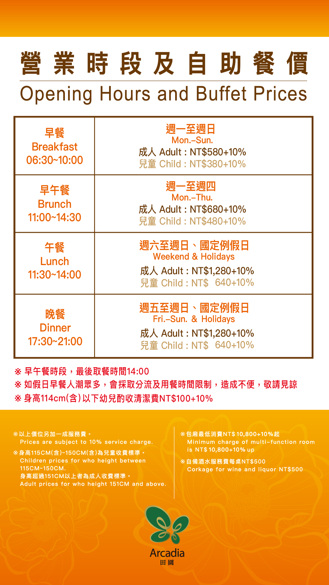 | 餐期 | 營業時間 | 成人價格 | 兒童價格 | 幼兒價格 |