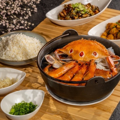 用大溪漁港各式海鮮燉煮的鮮甜湯頭,搭配剛炸過的貢寮米,剛炸過的米粒吸飽海鮮湯汁,搭配蛋汁、薑絲、蔥花,鹹甜軟嫩的口感讓人忍不住一口接著一口