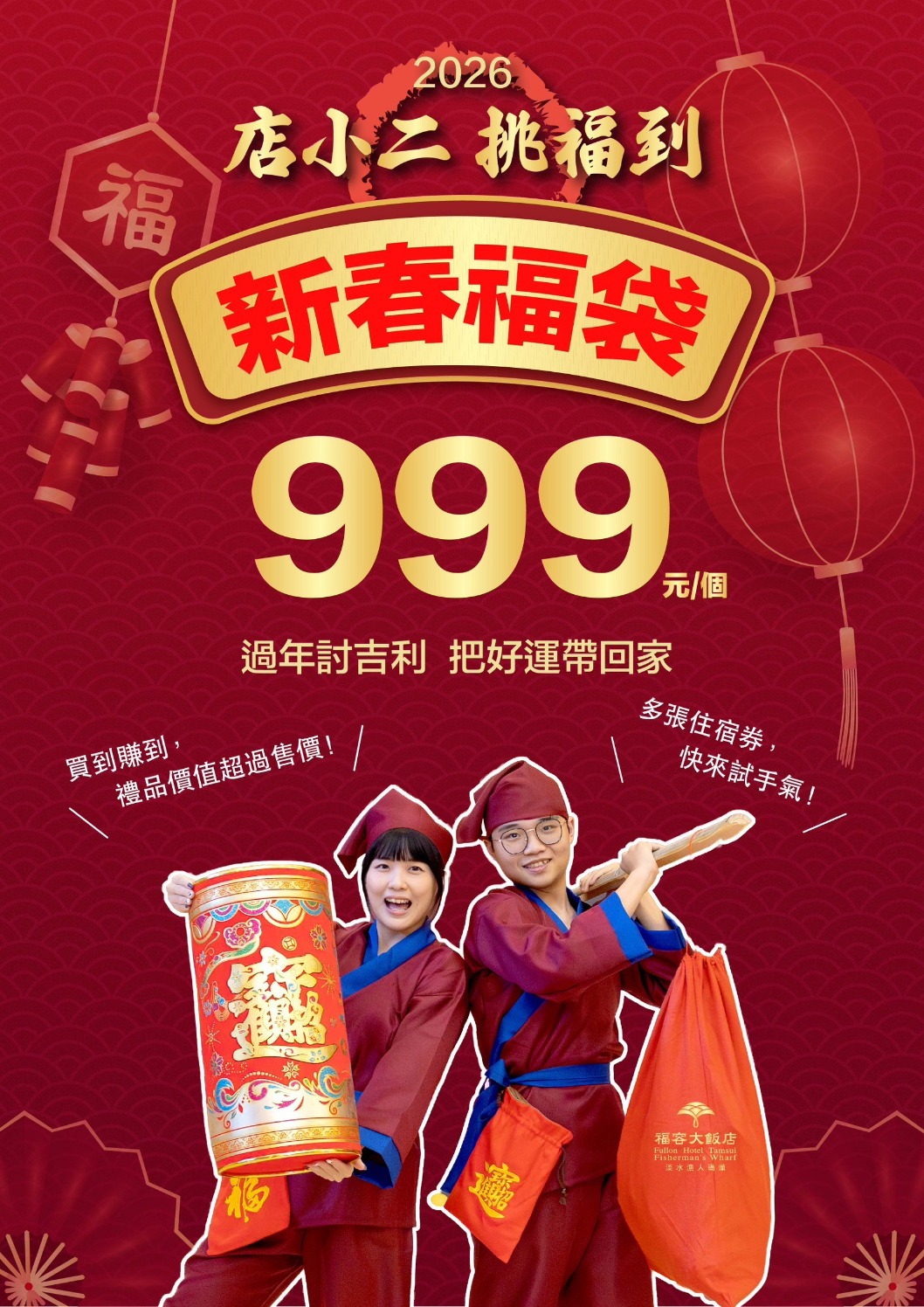 新春期間,店小二挑著福袋穿梭飯店各餐廳,每袋 999 元,內含禮品價值 保證超過售價,更有機會抽中 住宿券 等驚喜好禮。