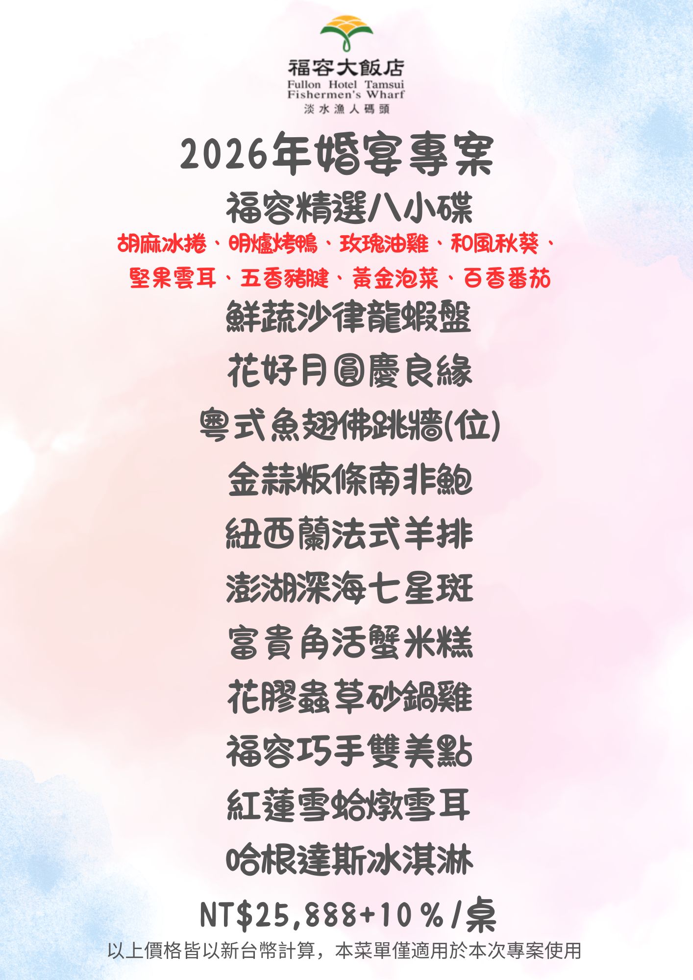 - 主廚特選婚宴佳餚 (餐價NT$21,888+10%/桌;餐價NT$25,888+10%/桌)
