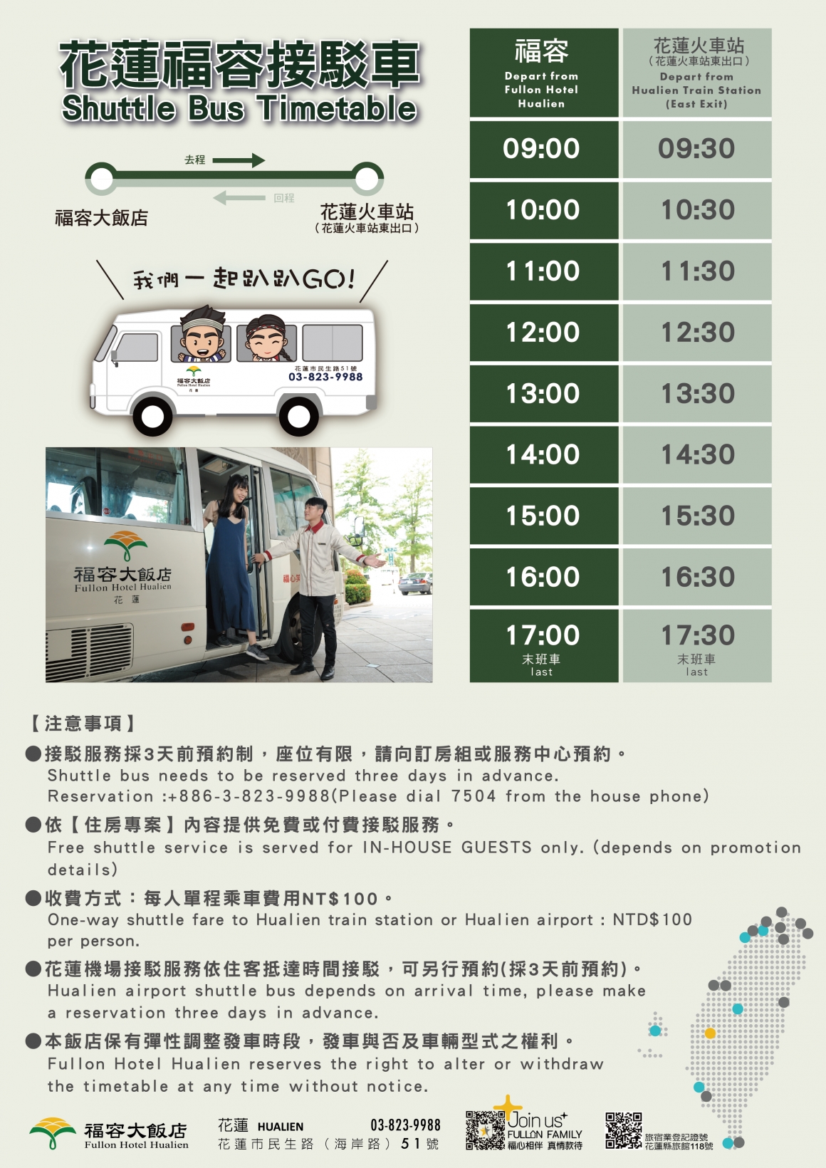 ● 花蓮駅・花蓮空港のシャトルは3日前までの予約制です。座席に限りがあるため、予約課またはサービスカウンターへご連絡ください。