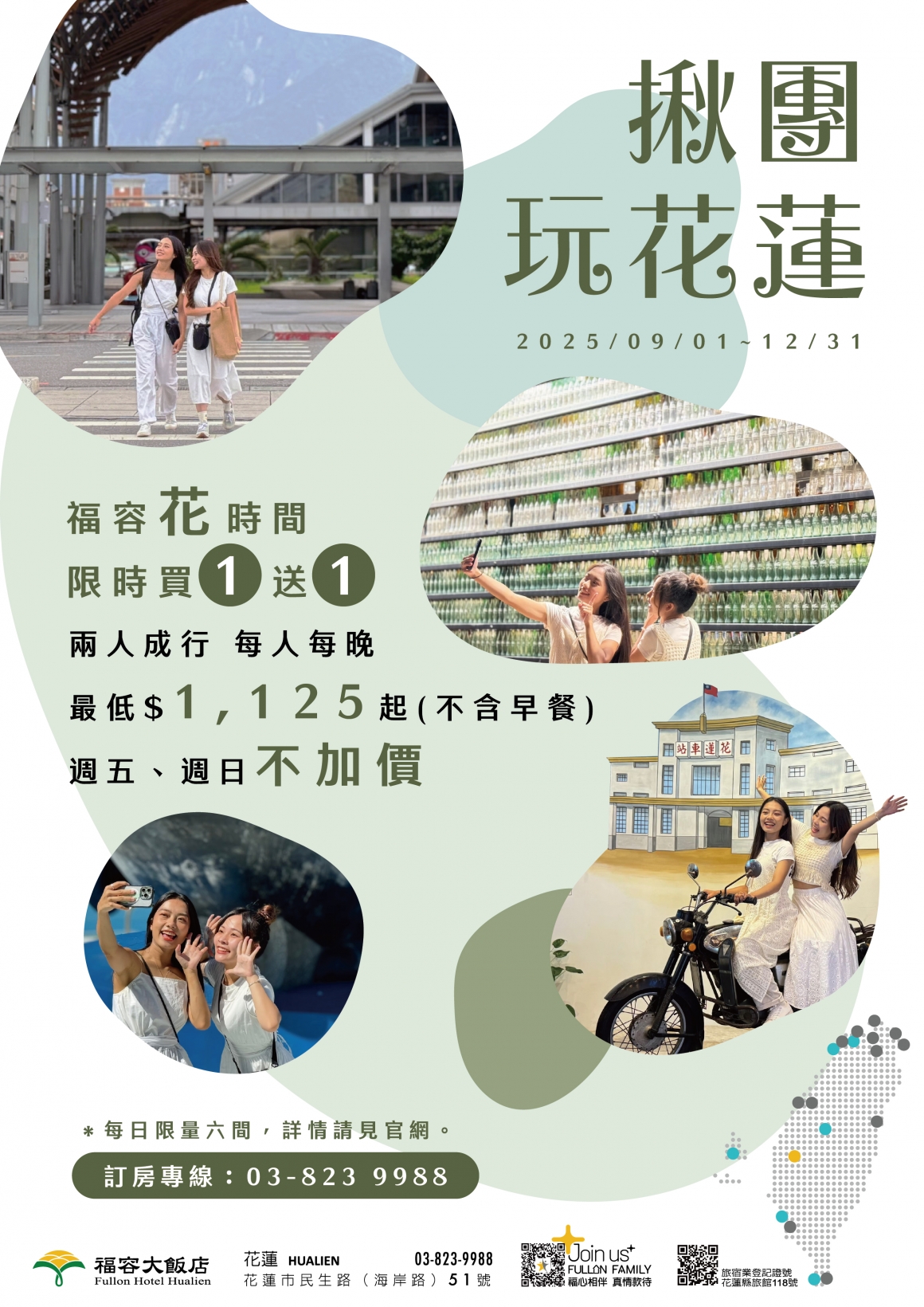 【好評加碼延長!】 花蓮最強聯名企劃 三天兩夜這樣住CP值最高! 六大飯店 x 在地特色 x 永續體驗,讓你享受不一樣的花蓮慢步調~一起永續遊花蓮即日起 - 2025.12.31 -