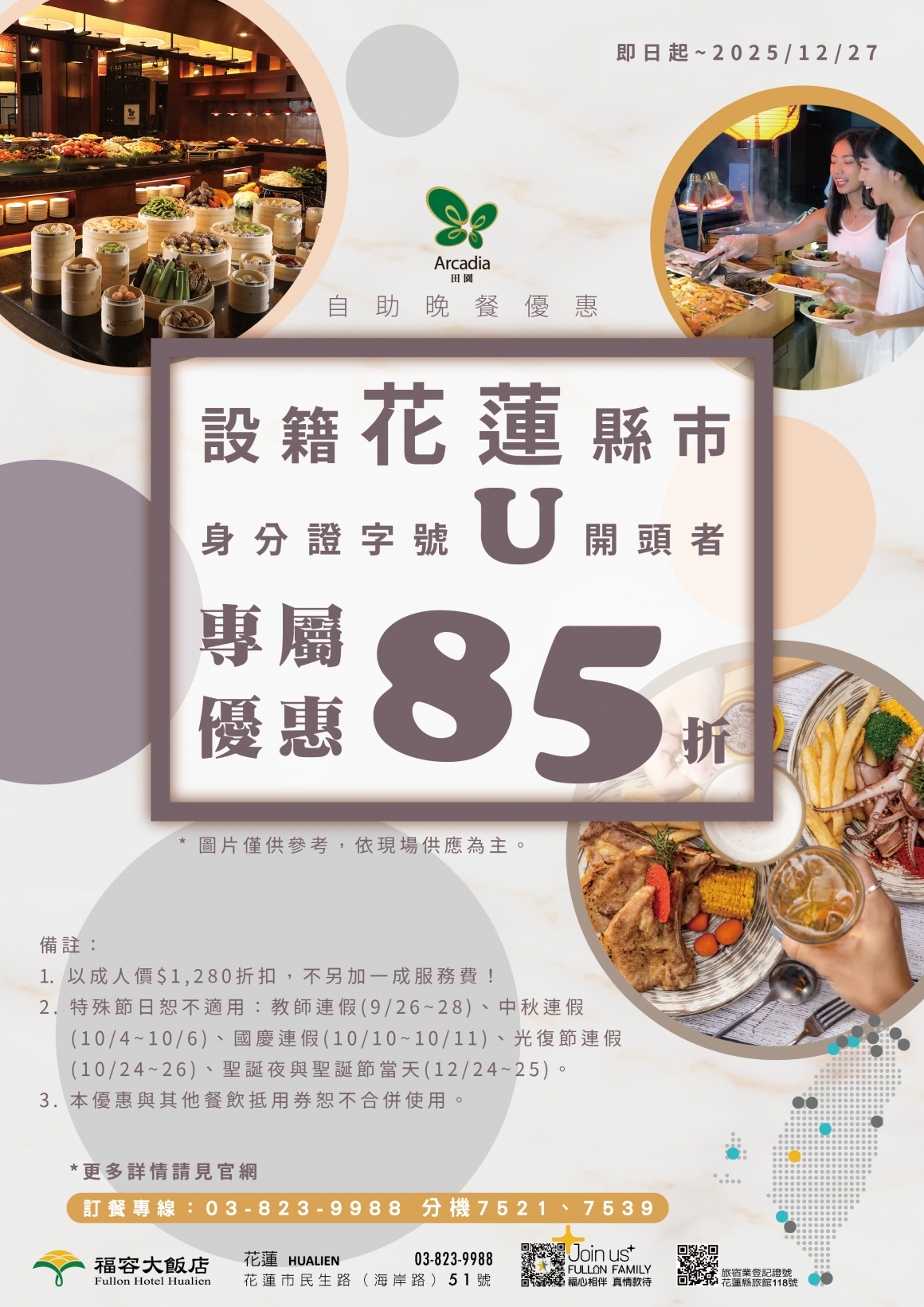 凡設籍花蓮縣市 或 身分證字號「U」開頭者● 享用晚餐出示證件 即享花蓮鄉親專屬優惠 85折!(以成人價做折扣優惠)