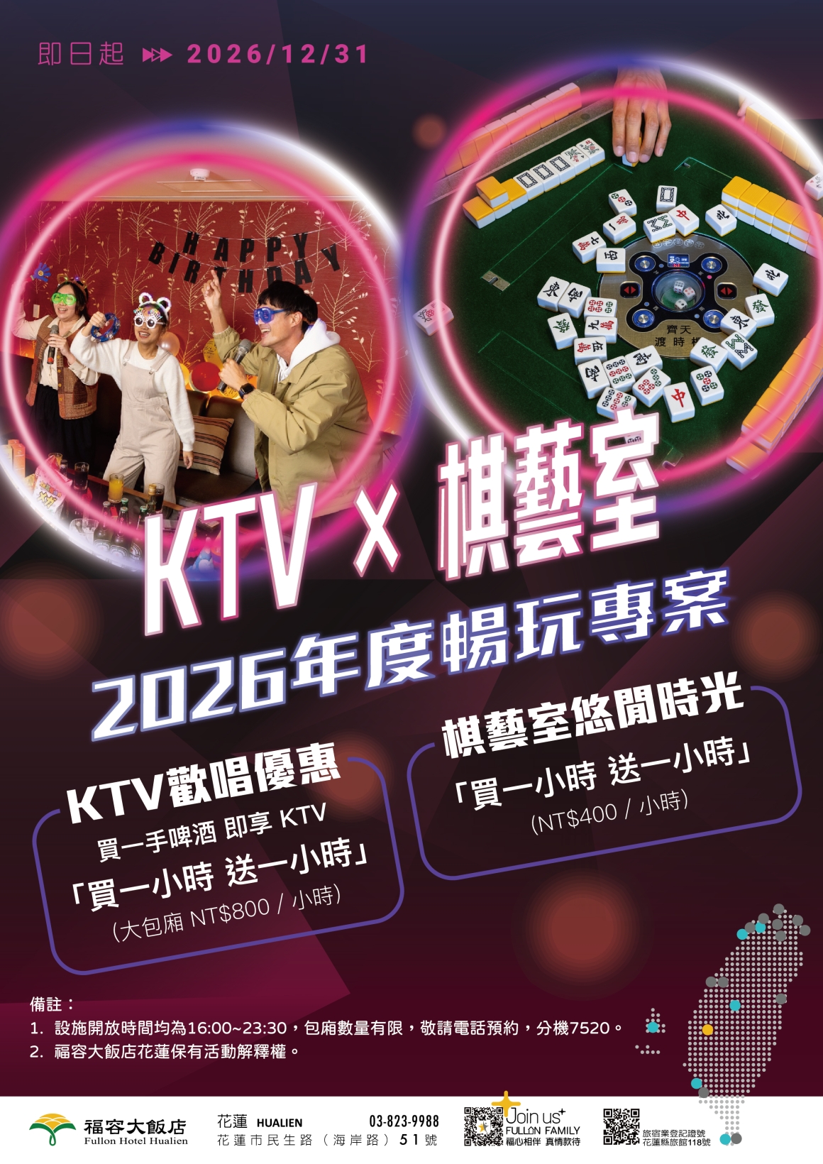 ⩥ 買一手啤酒(品項不限,限內用),KTV包廂買一小時送一小時 (NT$800/小時)