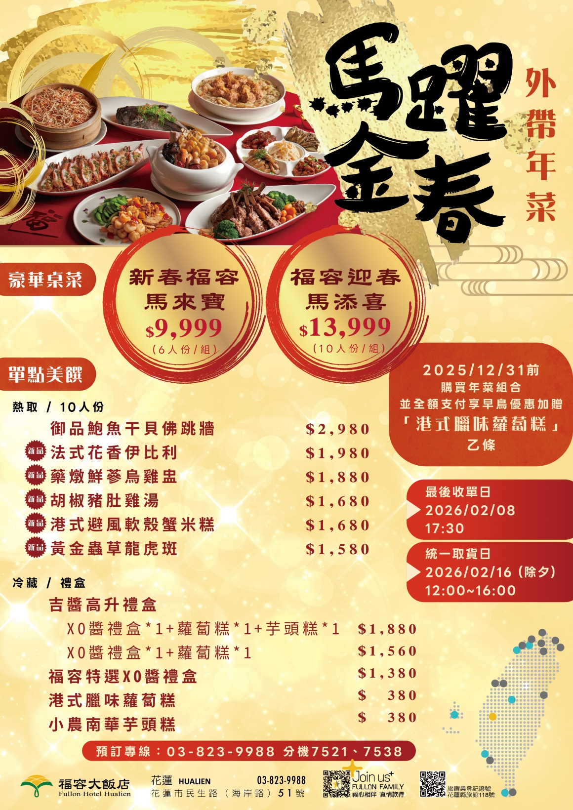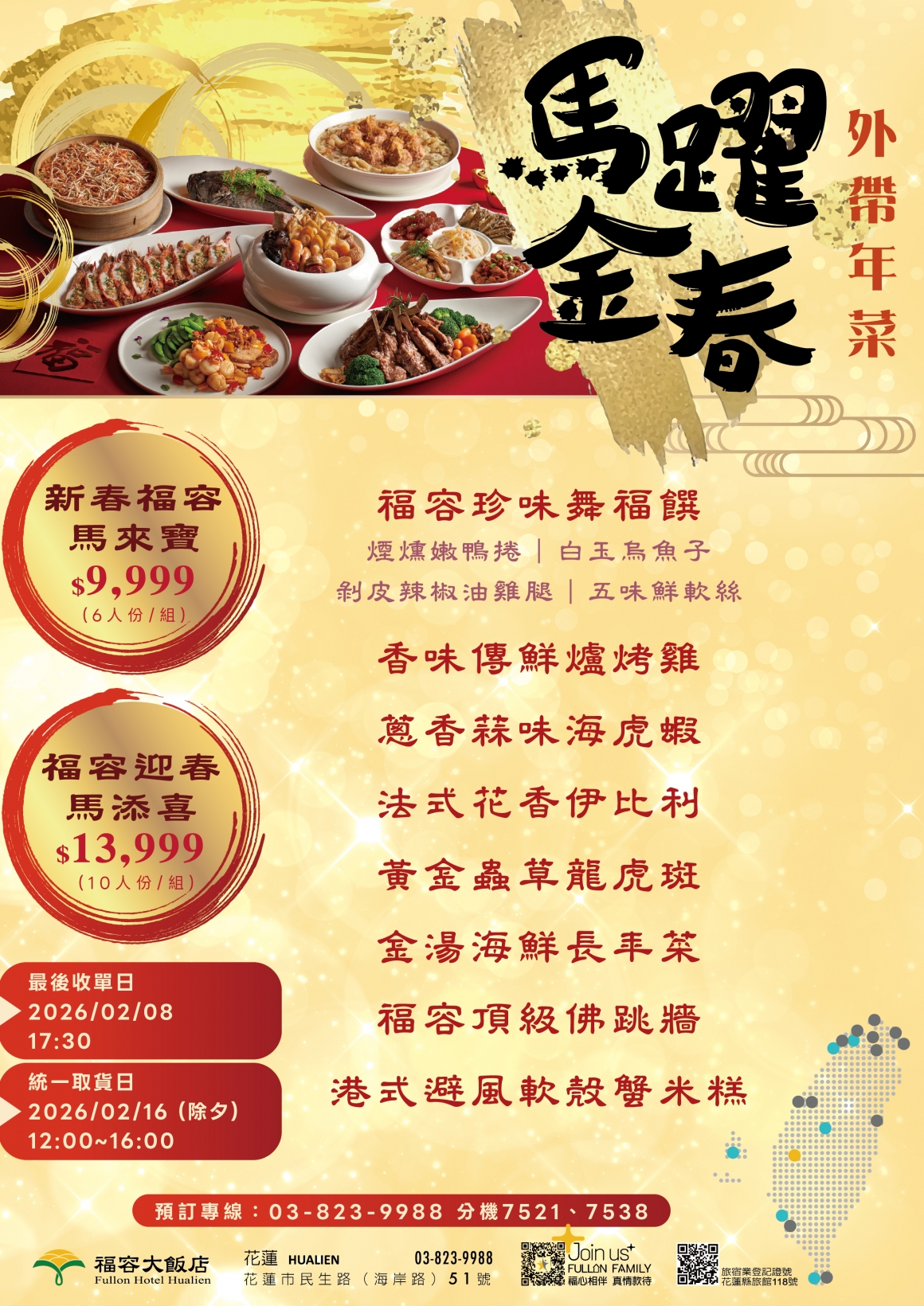 2026春節圍爐開放預訂囉! 親友難得團聚一塊,敘敘舊 花蓮福容提供西式自助晚餐或中式桌菜 座位有限要訂要快喔~2026.02.16 - 2026.02.22 -