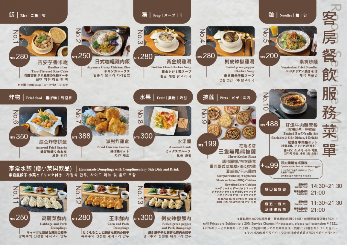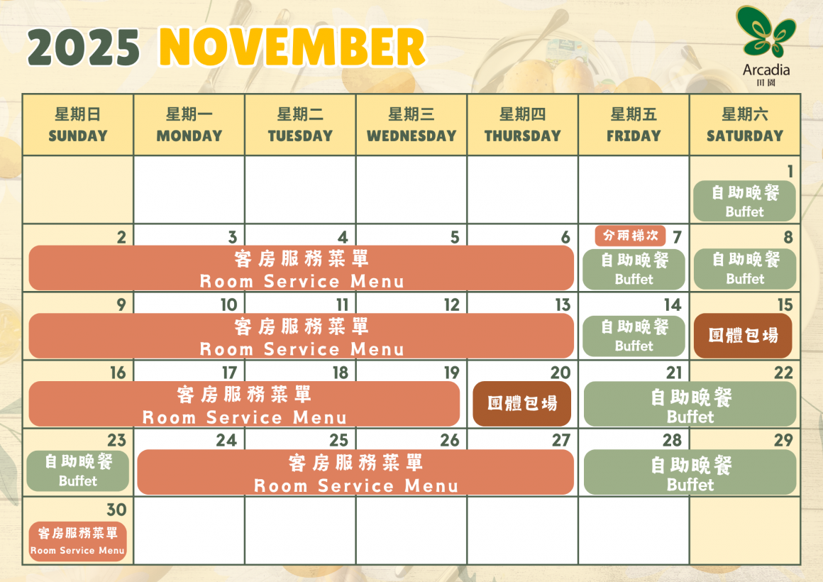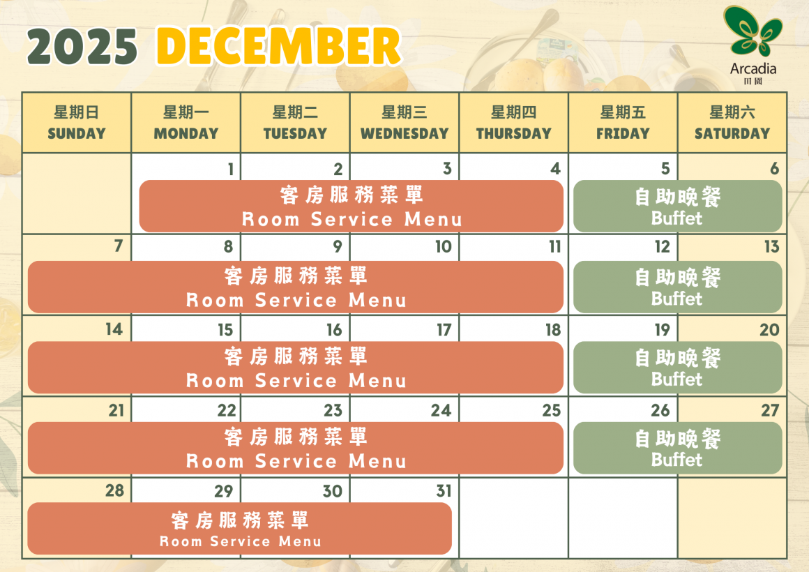| 自助晚餐開餐日 | 客房服務菜單 |