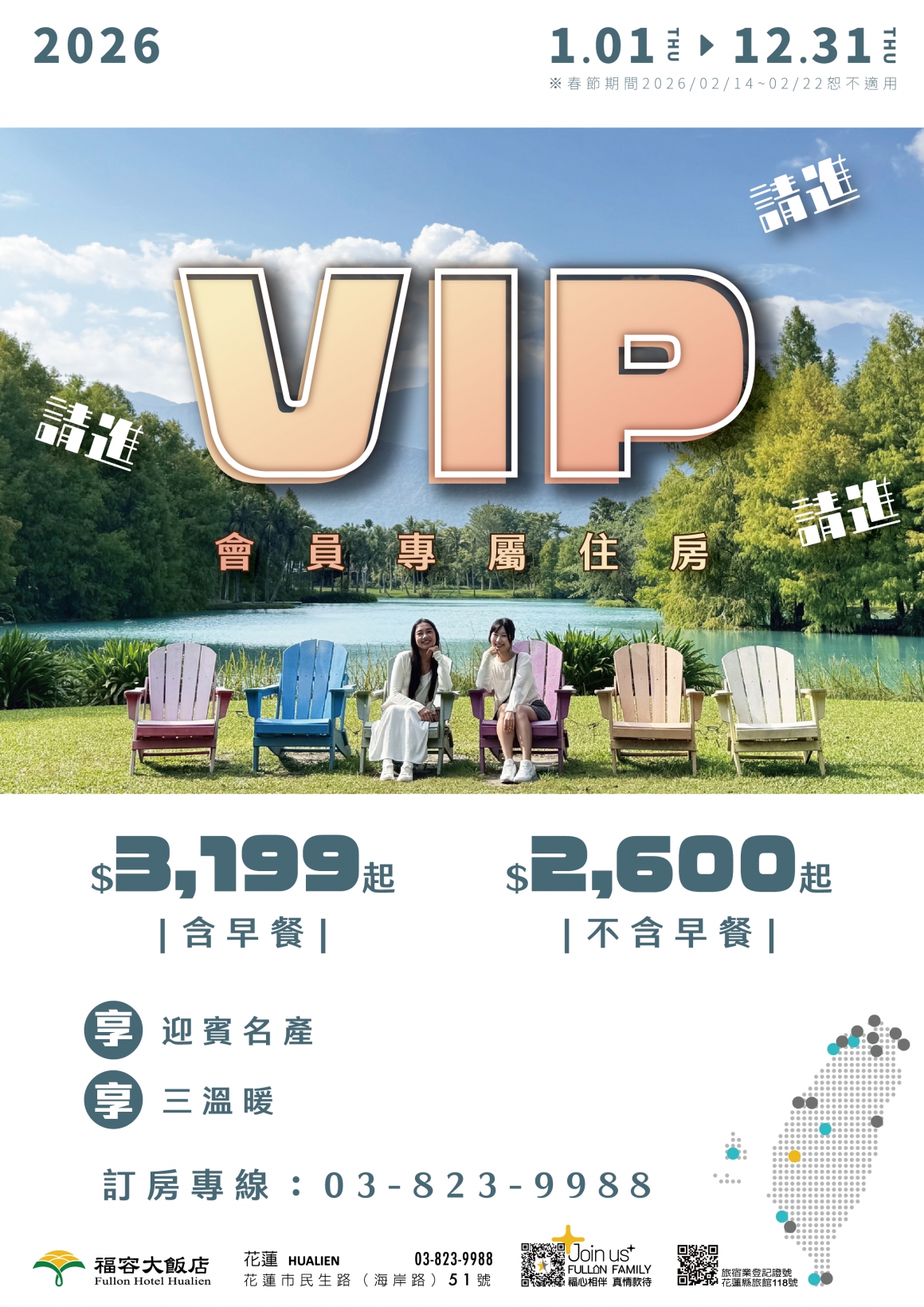 | ● 非平日期間加價如下: » 週五、週日:每晚NT$400 » 大假日(週六):每晚NT$1,000 ● 暑假期間(2026/07/01~08/31)加價如下: » 暑假旺日(週一~週四):每晚NT$800 » 暑假假日(週五、週日):每晚NT$1,200 » 暑假大假日(週六):每晚NT$1,500 ● 升海景每房每晚加$500 ● 春節期間恕不適用2026/02/14~02/22 ● 壽星佈置:於官網或訂房平台預訂住宿,即可以NT500加購壽星佈置乙組 (團體訂房及商務合約不適用) » 氣球、生日帽、軟性飲料*2、餅乾*4、花東限定乖乖*1、邊境法式甜點*2 (實際依現場佈置為主) » 若是預訂官網專案加購壽星佈置可享累積點數,恕不可會員折扣 » 春節期間02/14~02/22恕不適用 ● 雙重優惠恕不可合併使用。 ● 福容家會員可累積點數與分級折扣。 ● 福容大飯店花蓮保有活動解釋權。 |