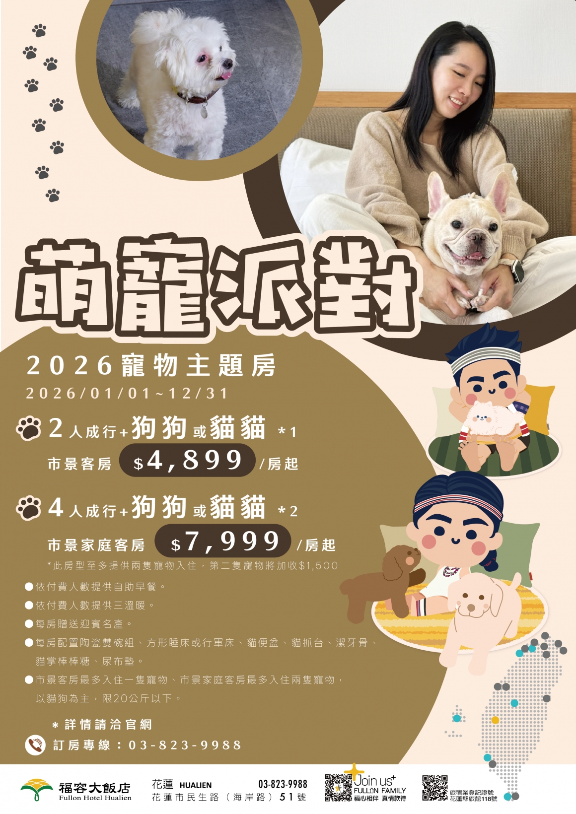 帶著毛孩的家庭旅行,就要住花蓮福容!雙人入住+毛孩只要$4,899起!還能入住專屬毛孩的樓層,一起創造屬於您們的回憶吧!