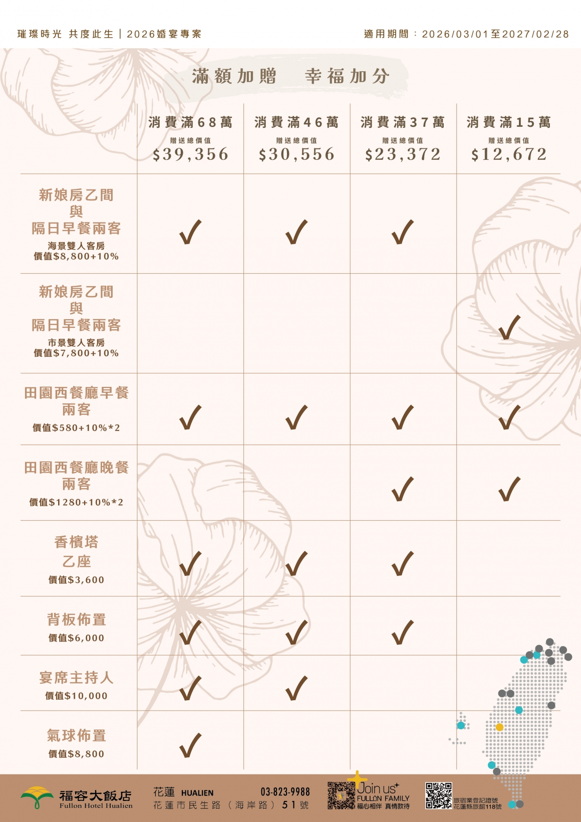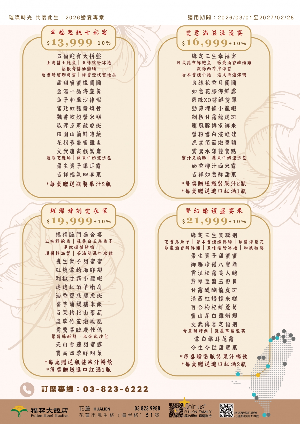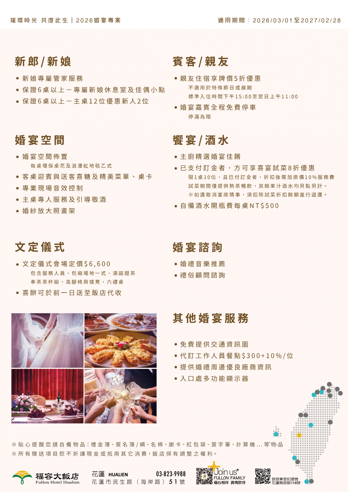 婚禮是新人向親友分享喜訊,以及分享幸福的場合! 花蓮福容擁有絕佳的宴會廳與師傅的好手藝,帶給您一生一次的美好回憶!2025.03.01 - 2026.02.28