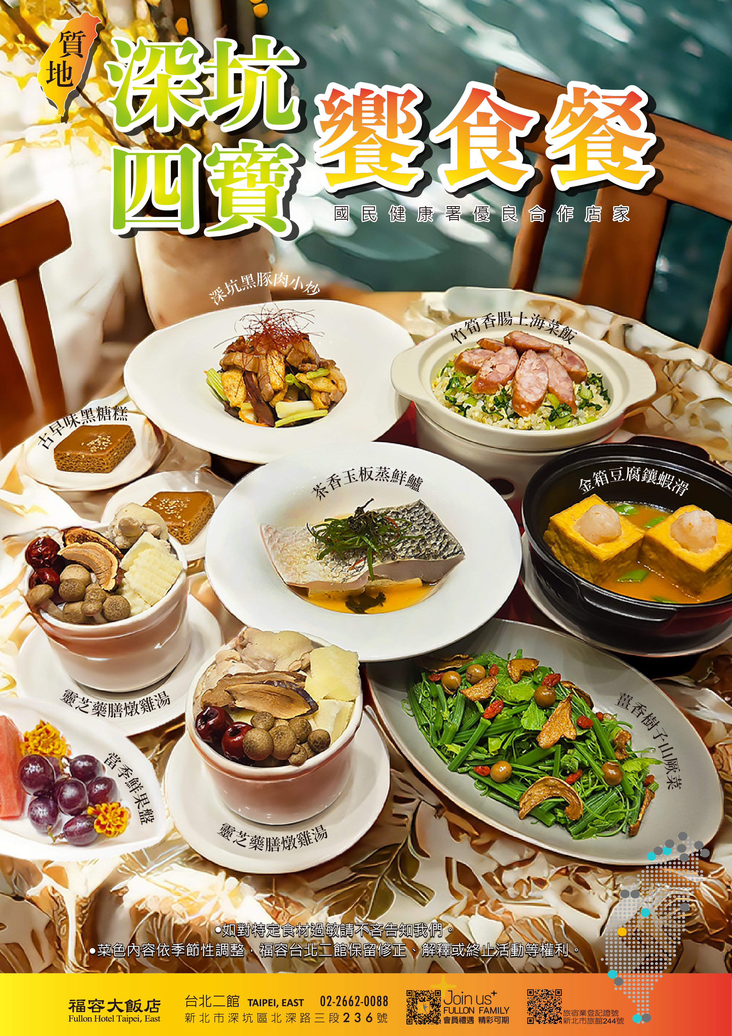 - 福容家會員獨享,入住升等豪華雙人房型 、質地飲食以深坑四寶為主。菜單下載