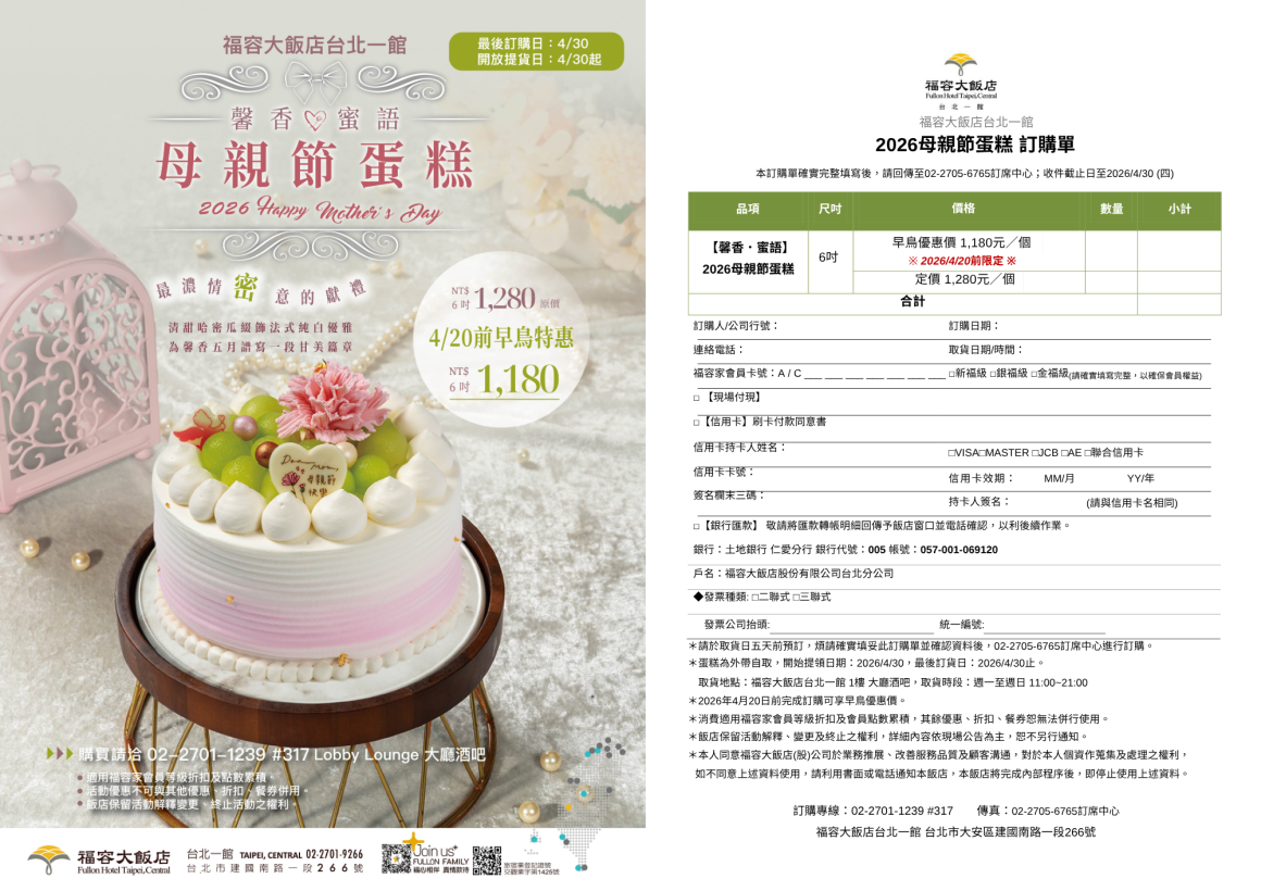 1. 請最晚於2026/4/30前來電(02-2796-1237 轉 317 大廳酒吧)或填寫訂購單回傳預訂。