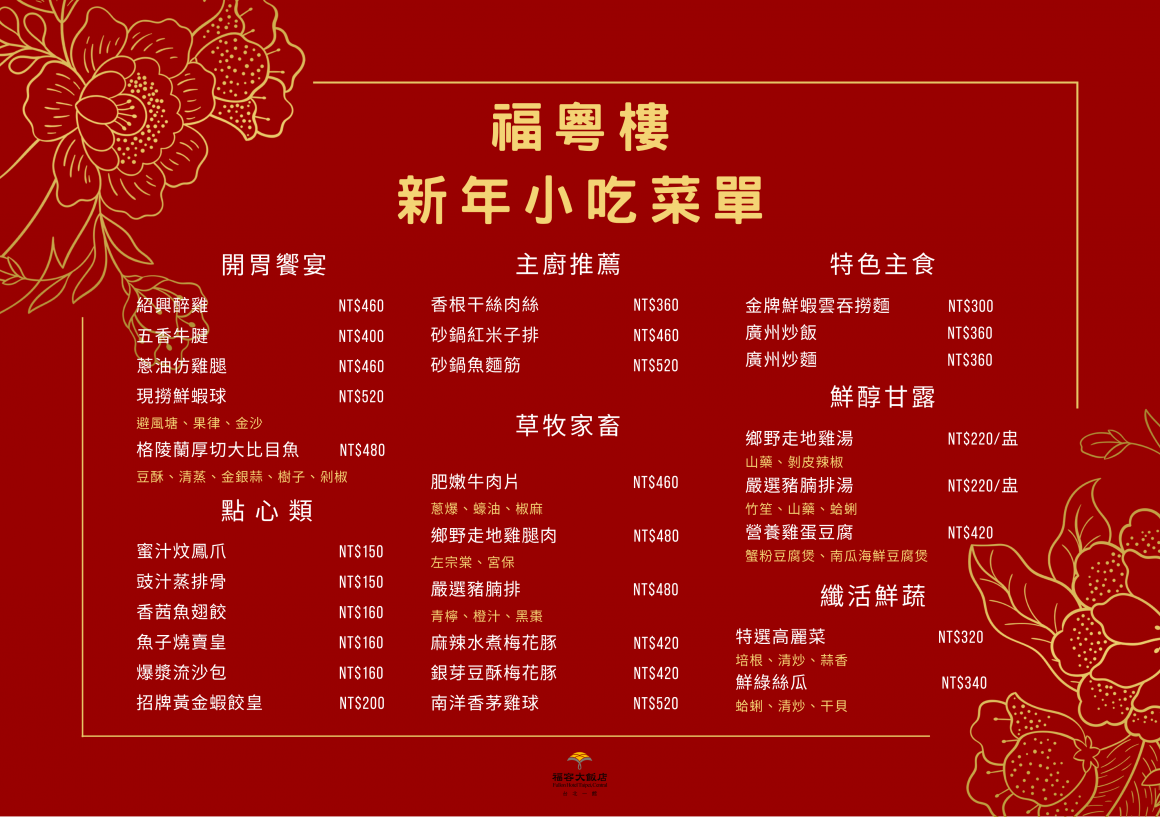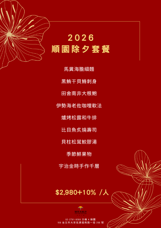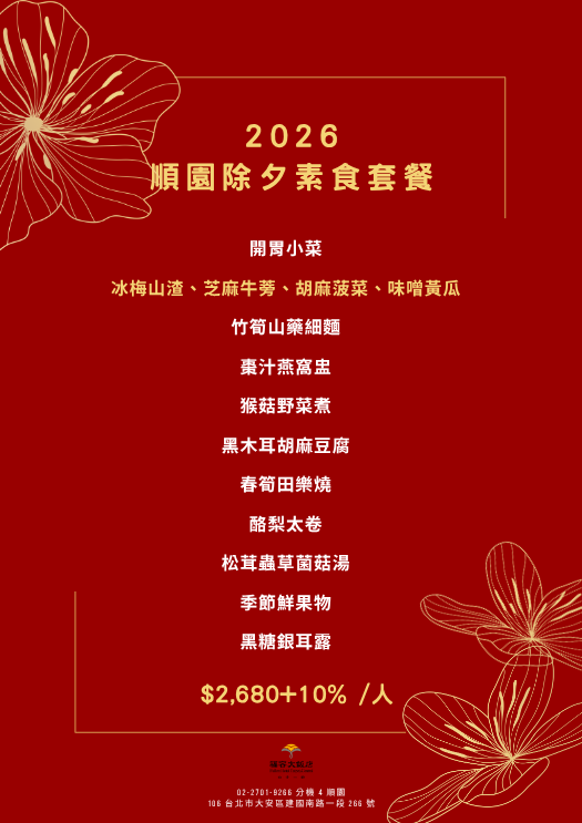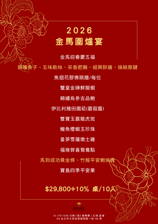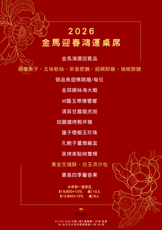 .預訂桌菜贈席間果汁暢飲。自備酒類酌收酒水服務費每桌NT$500。 .除夕圍爐桌菜最後預訂日為2026年2月5日,需預付全額訂金方才預訂完成。 .春節期間桌菜最後預訂日為2026年2月5日,需預付$5,000訂金才預訂完成。 |