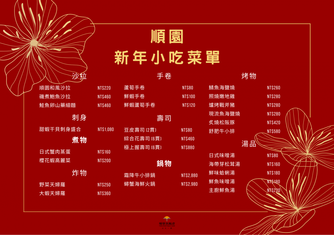 NT$19,800+10% /10人 NT$13,800+10% /6人 【 點我看菜單 】 - 【 春節精選單點 】 |