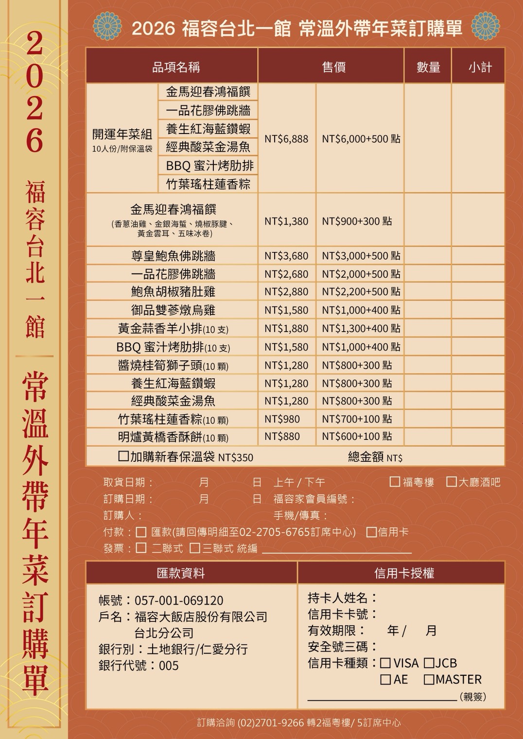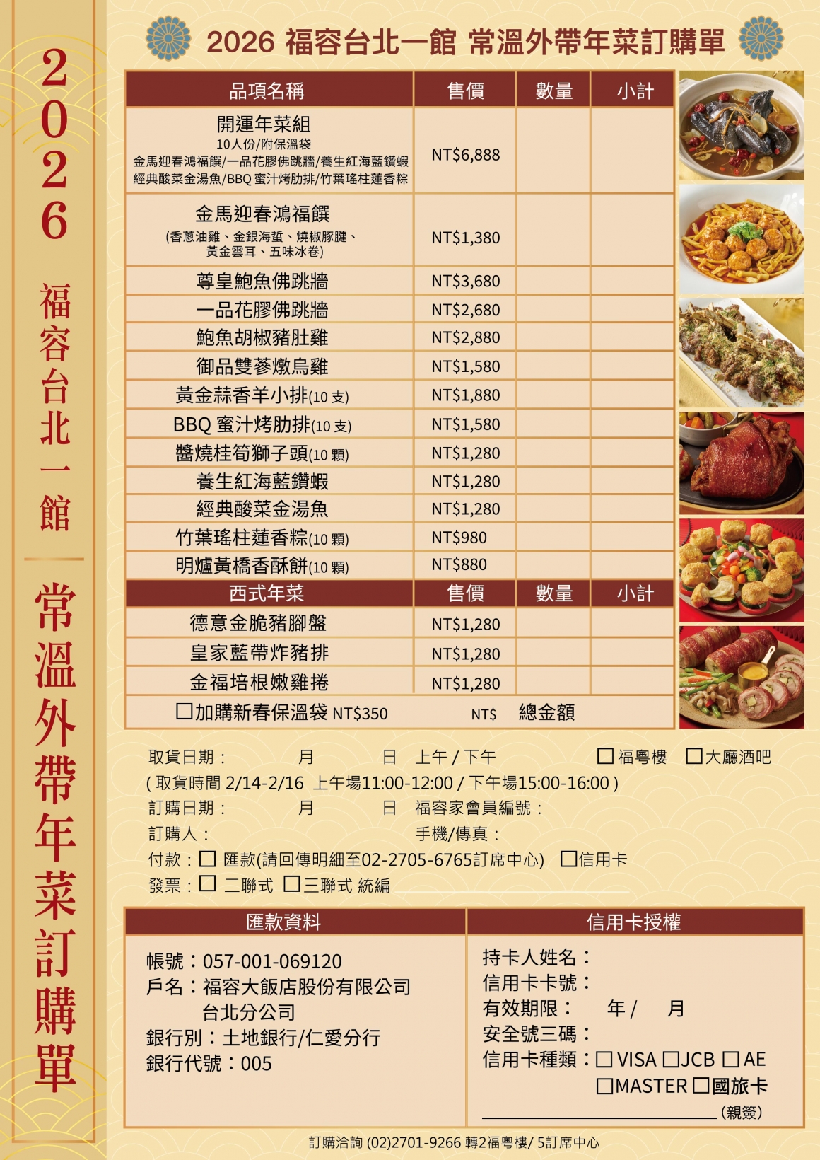 立即訂購:【2026常溫外帶年菜-下載訂購單】 【福容購線上下單】 【官方LINE洽詢】